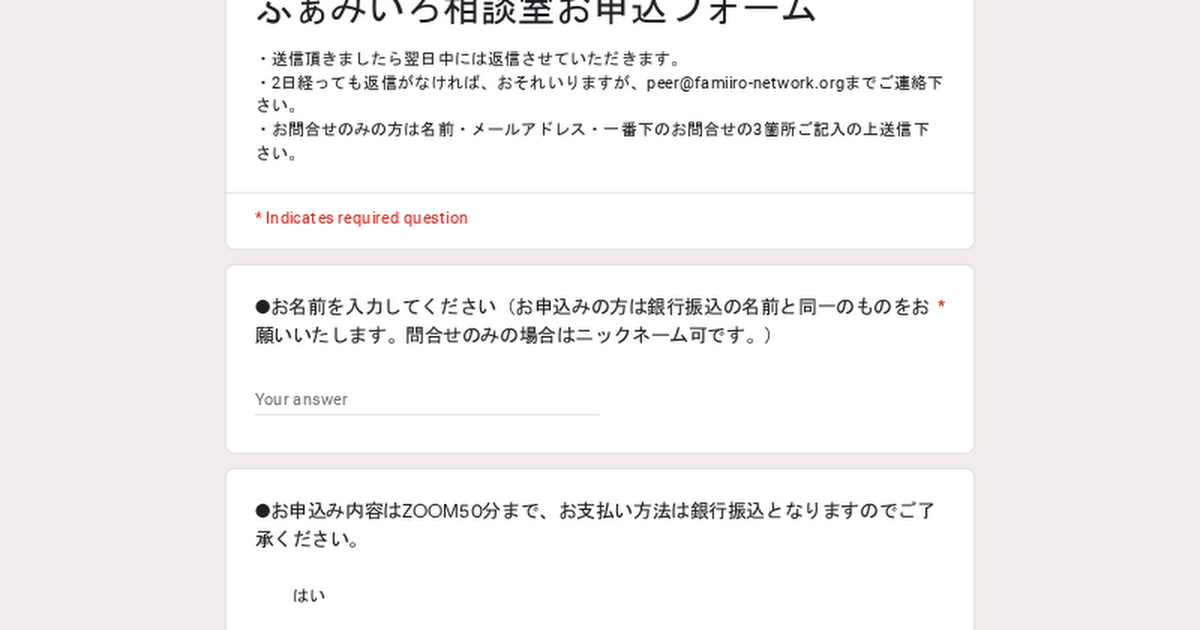 お問合せは下記のフォームか、peer@famiiro-network.orgまでメールにてお願い致します。